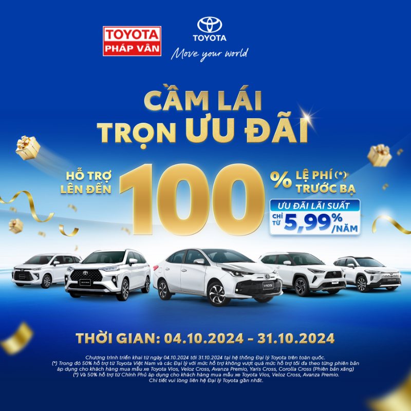 Lên tới 100% dành cho các dòng xe Toyota chỉ áp dụng đến hết 30/10/2024