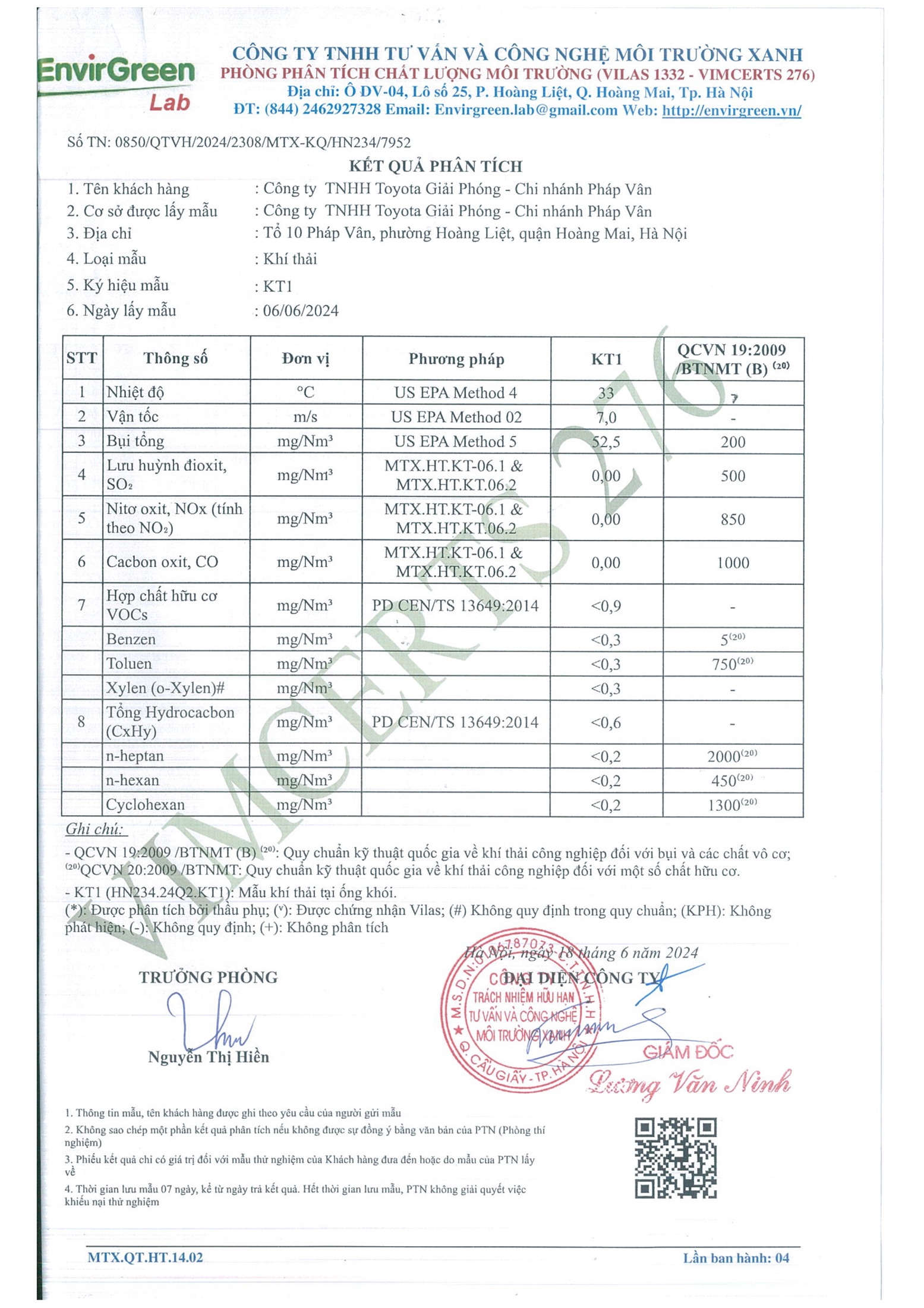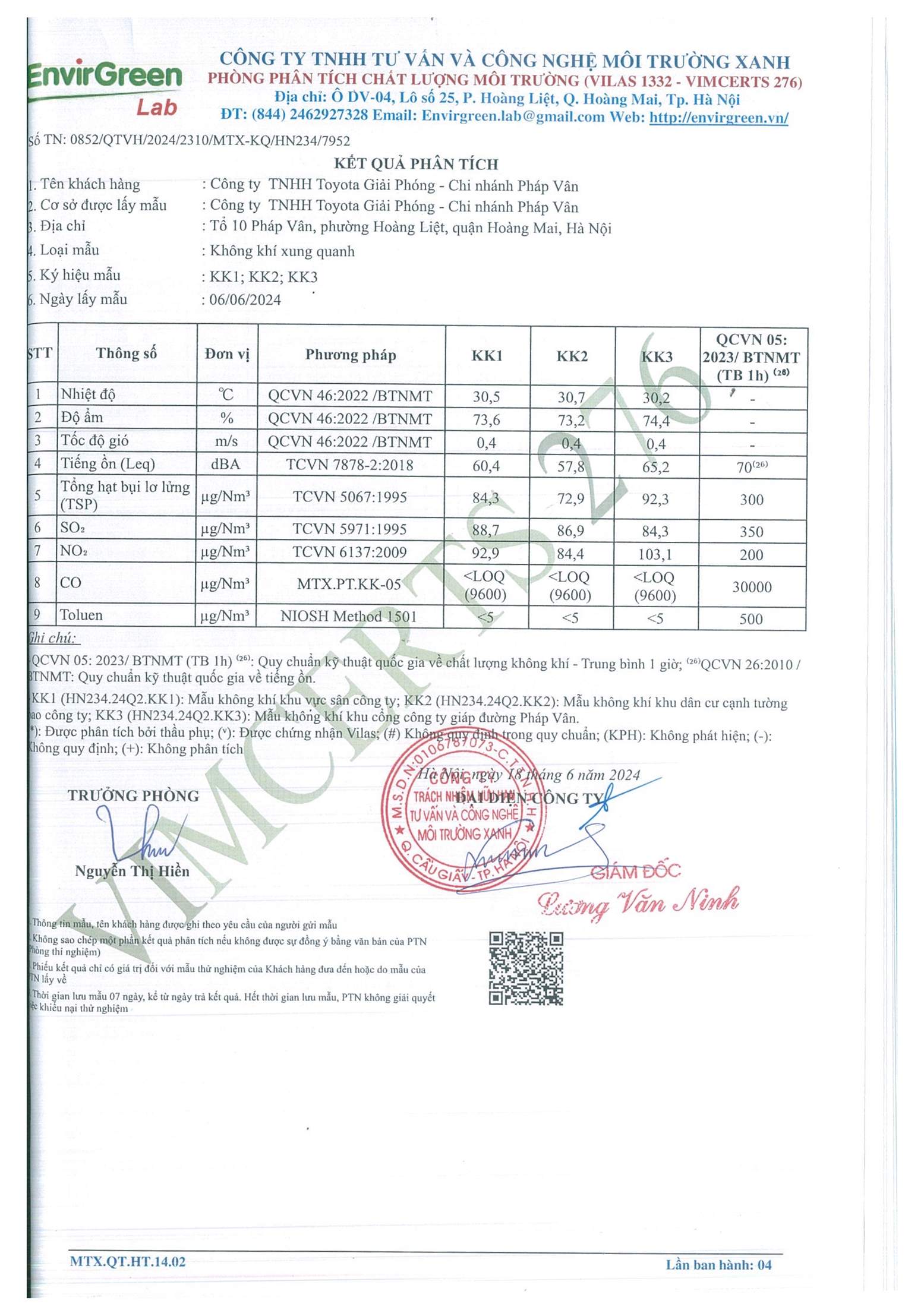 Báo cáo kết quả quan trắc môi trường định kỳ là một hình thức đánh giá chất lượng môi trường ngắn hạn tại Toyota Pháp Vân. Đánh giá chất lượng môi trường ở đây nghĩa là đánh giá một cách tổng quan trên nhiều nguồn phát sinh chất thải như: Không khí, nước thải. Hình thức đánh giá bằng cách đo đạc mẫu không khí, nước thải theo quy định của nhà nước. Từ đó đánh giá được các ảnh hưởng của nguồn ô nhiễm đối với môi trường giúp cho Công ty ngăn chặn được những vấn đề ô nhiễm, xây dựng các biện pháp giảm thiểu ô nhiễm và đưa ra các giải pháp xử lý môi trường thích hợp hơn.
