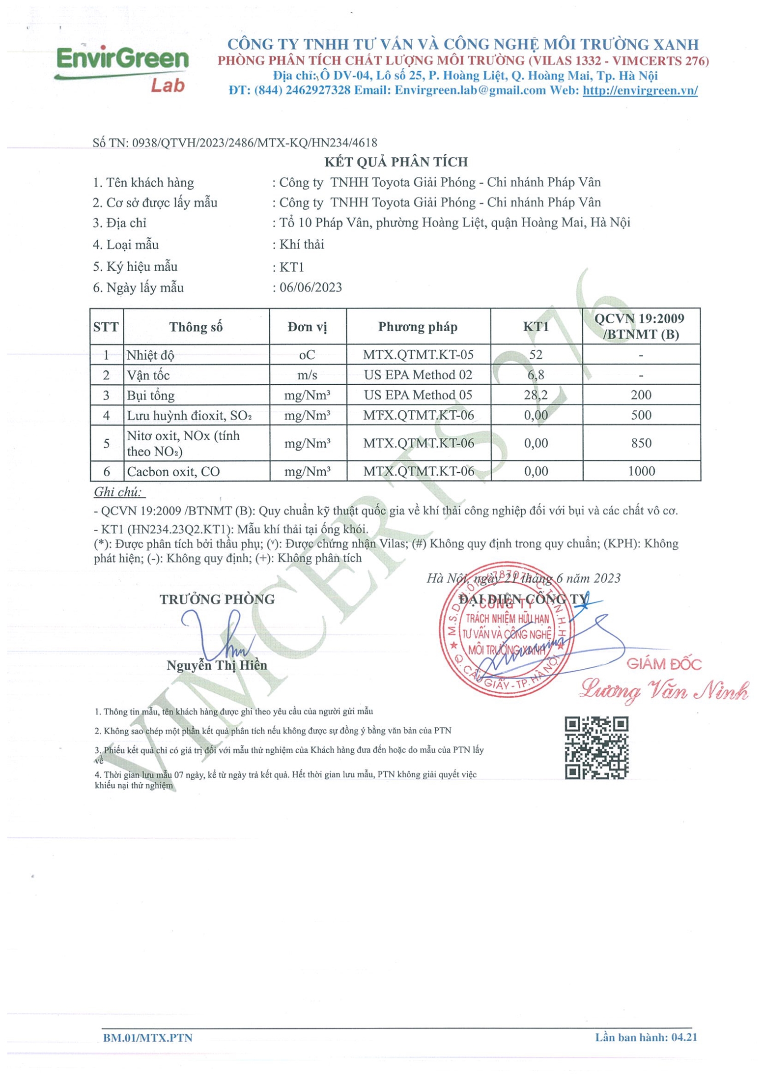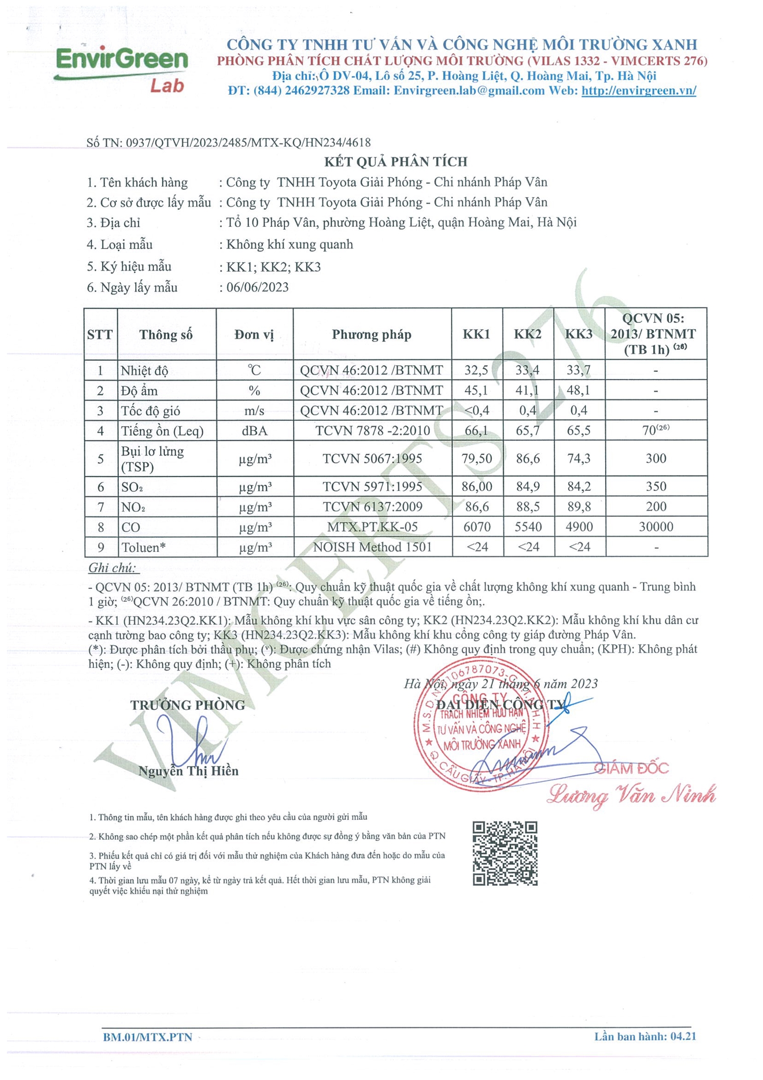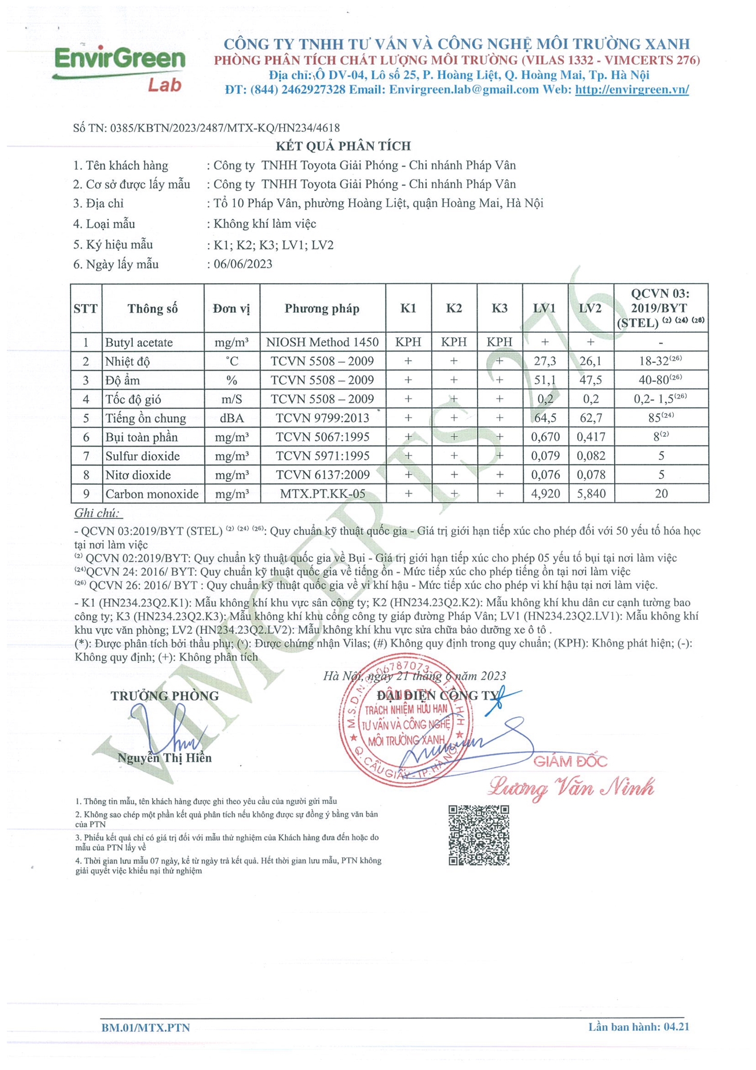 Báo cáo kết quả quan trắc môi trường định kỳ là một hình thức đánh giá chất lượng môi trường ngắn hạn tại Toyota Pháp Vân. Đánh giá chất lượng môi trường ở đây nghĩa là đánh giá một cách tổng quan trên nhiều nguồn phát sinh chất thải như: Không khí, nước thải. Hình thức đánh giá bằng cách đo đạc mẫu không khí, nước thải theo quy định của nhà nước. Từ đó đánh giá được các ảnh hưởng của nguồn ô nhiễm đối với môi trường giúp cho Công ty ngăn chặn được những vấn đề ô nhiễm, xây dựng các biện pháp giảm thiểu ô nhiễm và đưa ra các giải pháp xử lý môi trường thích hợp hơn.