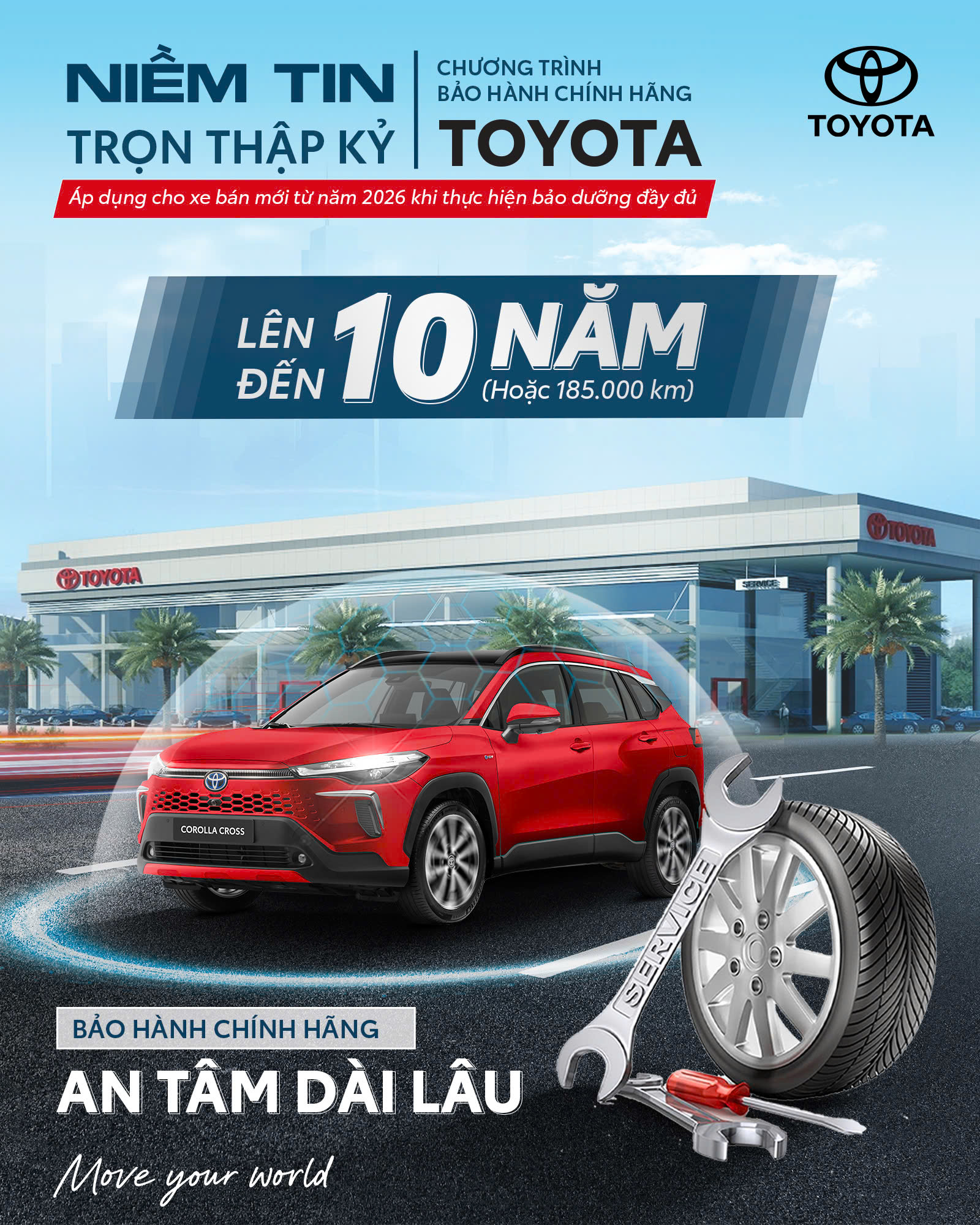 Tại Toyota, chúng tôi tin rằng sự bền bỉ của một chiếc xe không chỉ đến từ chất lượng sản xuất, mà còn từ sự chăm sóc tận tâm trong suốt quá trình sử dụng. Bảo dưỡng định kỳ tại hệ thống Đại lý ủy quyền không chỉ giúp "xế yêu" vận hành êm ái, mà còn là điều kiện tiên quyết để bạn tận hưởng đặc quyền bảo hành dài nhất thị trường.