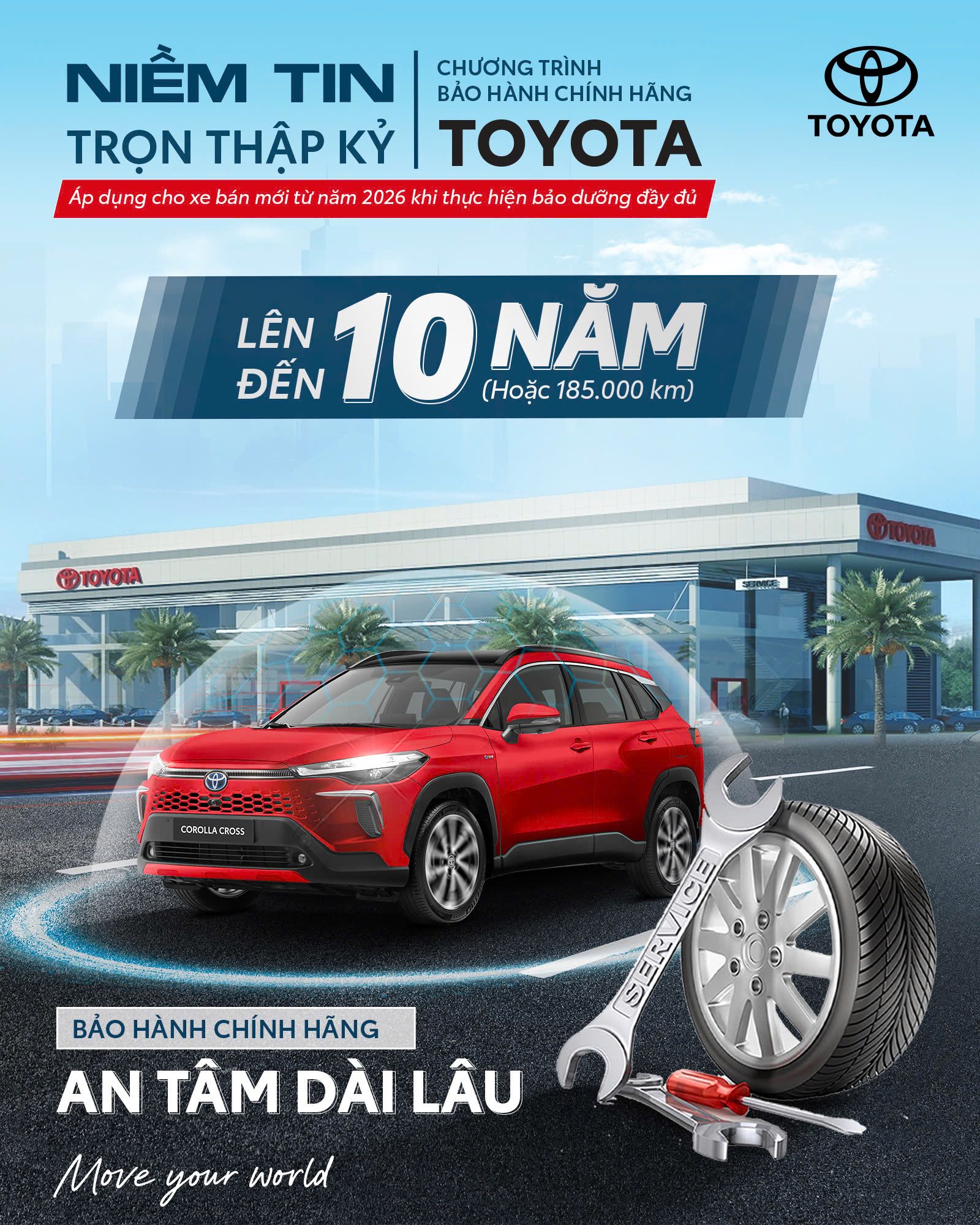 Khi thực hiện bảo dưỡng đầy đủ theo khuyến nghị của nhà sản xuất tại hệ thống Đại lý Ủy quyền chính hãng Toyota, khách hàng sẽ được duy trì quyền lợi trong chương trình bảo hành đặc biệt mang tên "Niềm tin trọn thập kỷ".