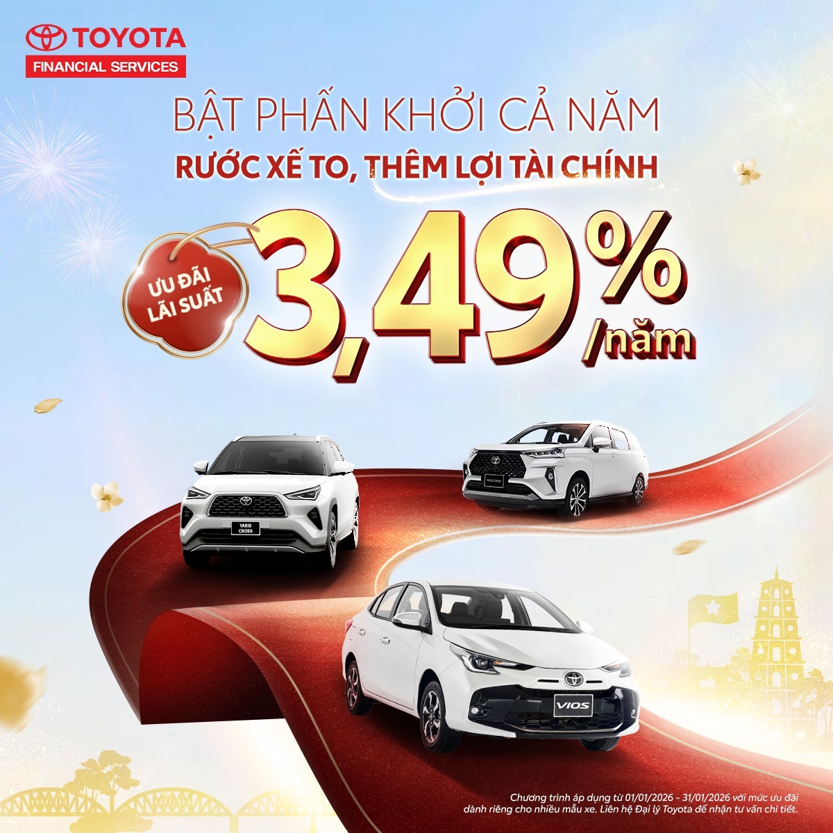 Chương trình áp dụng cho khách hàng mua xe và hoàn tất thủ tục vay từ ngày 01/01/2026 đến hết ngày 31/01/2026 với các gói lãi suất cực kỳ linh hoạt: