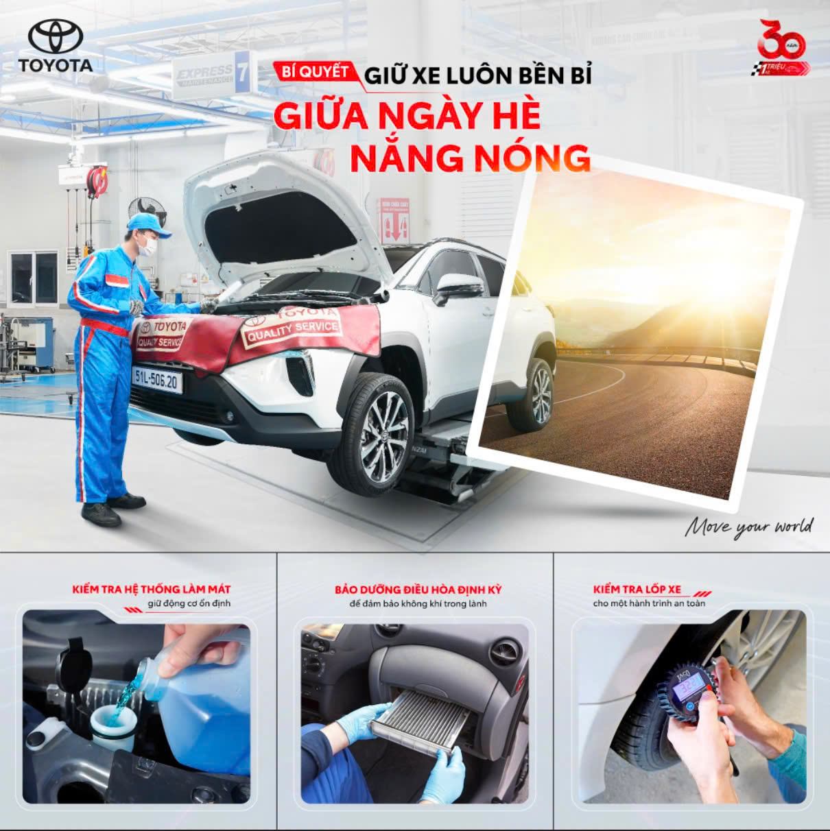 Và đặc biệt, đừng quên bảo dưỡng định kỳ tại Toyota! Với đội ngũ kỹ thuật viên giàu kinh nghiệm và quy trình bảo dưỡng chuyên nghiệp chuẩn toàn cầu, Toyota sẽ giúp xe của bạn luôn sẵn sàng cho mọi hành trình.