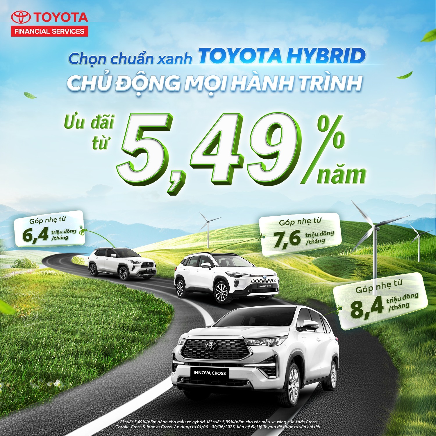 Tháng 6 này, TFSVN mang tới ưu đãi lãi suất từ 5,49%/năm cố định 6 tháng và 7,49%/năm cố định 6 tháng tiếp theo, dành cho các mẫu xe Hybrid thời thượng: Yaris Cross, Corolla Cross, Innova Cross.