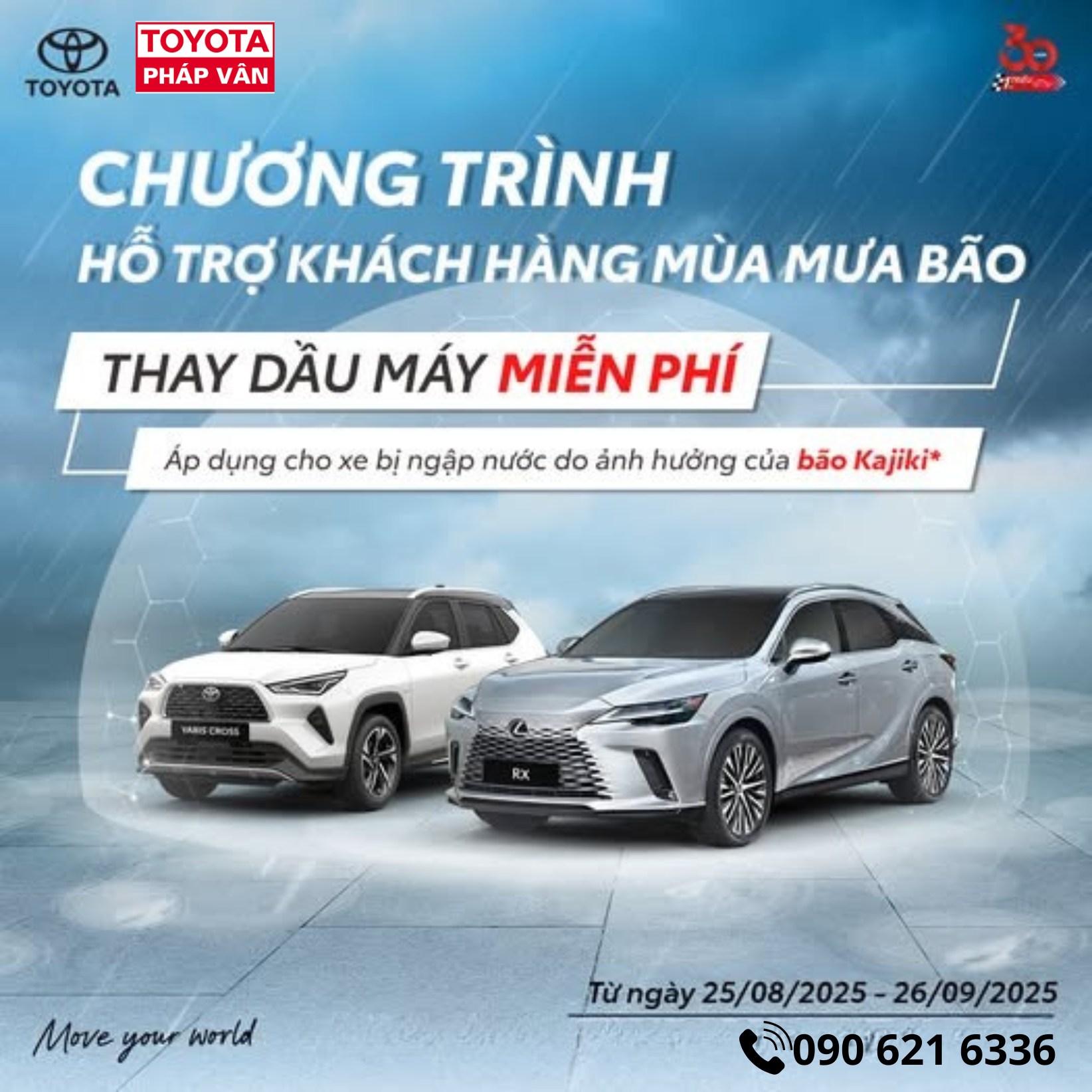 Nhằm chung tay hỗ trợ khách hàng, Toyota triển khai chương trình miễn phí thay dầu máy cho xe Toyota/Lexus không may bị ngập nước, áp dụng từ 25/8 đến hết 26/9/2025.