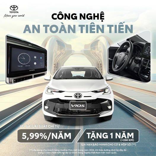 (**) Áp dụng cho khách hàng mua xe Vios mới trong năm 2024, khi bảo dưỡng định kỳ đầy đủ trong 3 năm (100K KM) tại đại lý chính hãng Toyota Việt Nam trên toàn quốc.