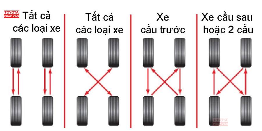 Đối với xe có tay lái thuận ở Việt Nam thì thứ tự mòn như sau: (1) lốp trước bên phải (2) lốp trước bên trái (3) lốp sau bên phải và (4) lốp sau bên trái.
