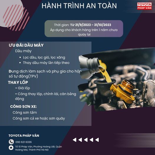 Chương trình dịch vụ "HÀNH TRÌNH AN TOÀN" được áp dụng tại Toyota Pháp Vân triển khai từ 21/9/2023 đến 31/10/2023: