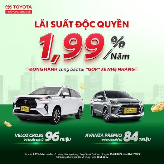 Bạn là đối tác tài xế Grab/Be có nhu cầu nâng cấp, lên đời xe 7 chỗ mới để gia tăng lợi nhuận? Tìm hiểu ngay gói vay Balloon của Tài chính Toyota với mức lãi suất ưu đãi chỉ 1,99%/năm (cố định 6 tháng) áp dụng với các dòng xe Veloz Cross & Avanza Premio.