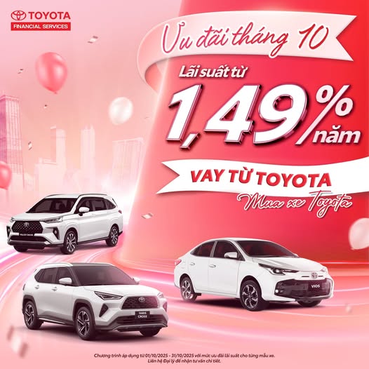 Tháng 10 - thời điểm lý tưởng để bạn hoàn tất những kế hoạch còn dang dở trong năm và sẵn sàng cho mùa lễ hội cuối năm. Để hành trình sở hữu chiếc xe Toyota mơ ước trở nên dễ dàng và nhẹ nhàng hơn bao giờ hết, TFSVN mang đến chương trình ưu đãi lãi suất cực kỳ hấp dẫn trong tháng này: