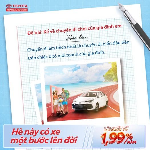 Chuyến đi rực rỡ của gia đình luôn là chuyến đi để lại nhiều kỉ niệm nhất. Để giúp bạn biến chuyến đi trong mơ của gia đình thành hiện thực, Tài chính Toyota mang tới gói lãi suất ưu đãi chỉ từ 1,99%/năm, cùng thời gian vay lên đến 8 năm và khoản trả trước nhẹ nhàng chỉ từ 15%.