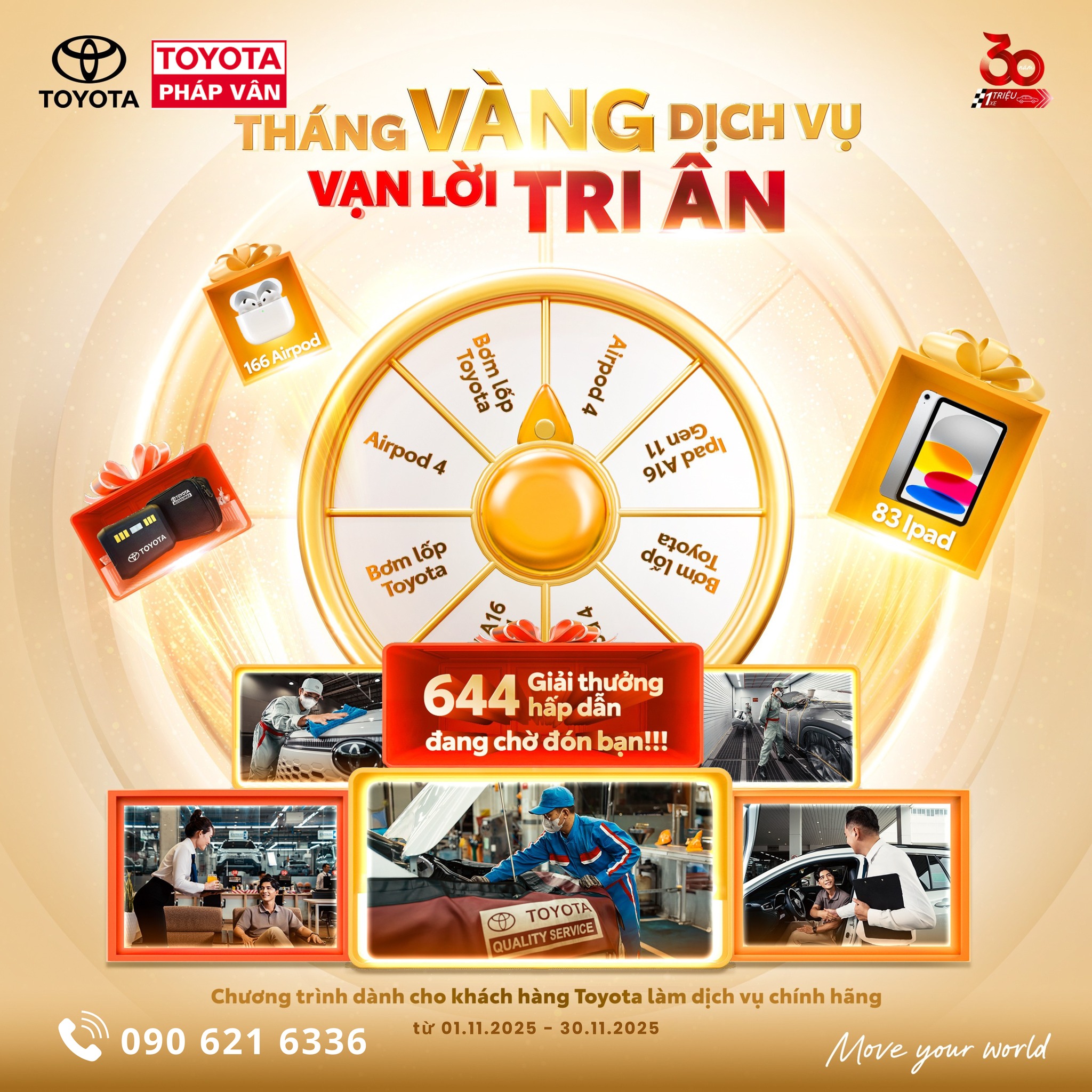 Tháng 10 này, Toyota trân trọng mang đến chương trình Tháng Vàng Dịch Vụ – Vạn Lời Tri Ân cùng chuỗi sự kiện tri ân khách hàng tại toàn bộ hệ thống đại lý Toyota trên toàn quốc như một lời cảm ơn chân thành và sâu sắc nhất.