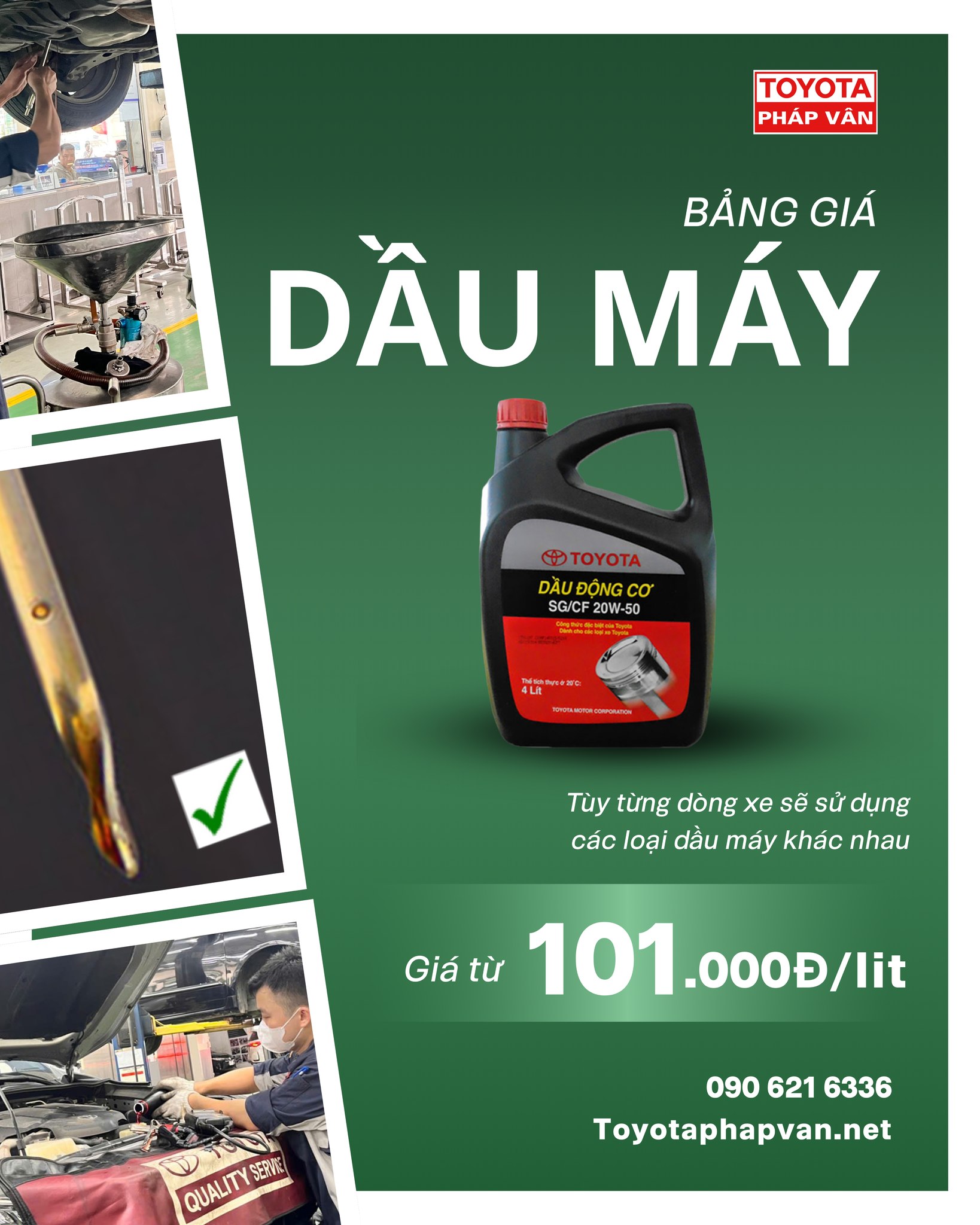 Để đảm bảo động cơ luôn hoạt động trong trạng thái tốt nhất, Toyota Pháp Vân cung cấp dịch vụ thay dầu máy chính hãng với cam kết về chất lượng và sự minh bạch tuyệt đối: