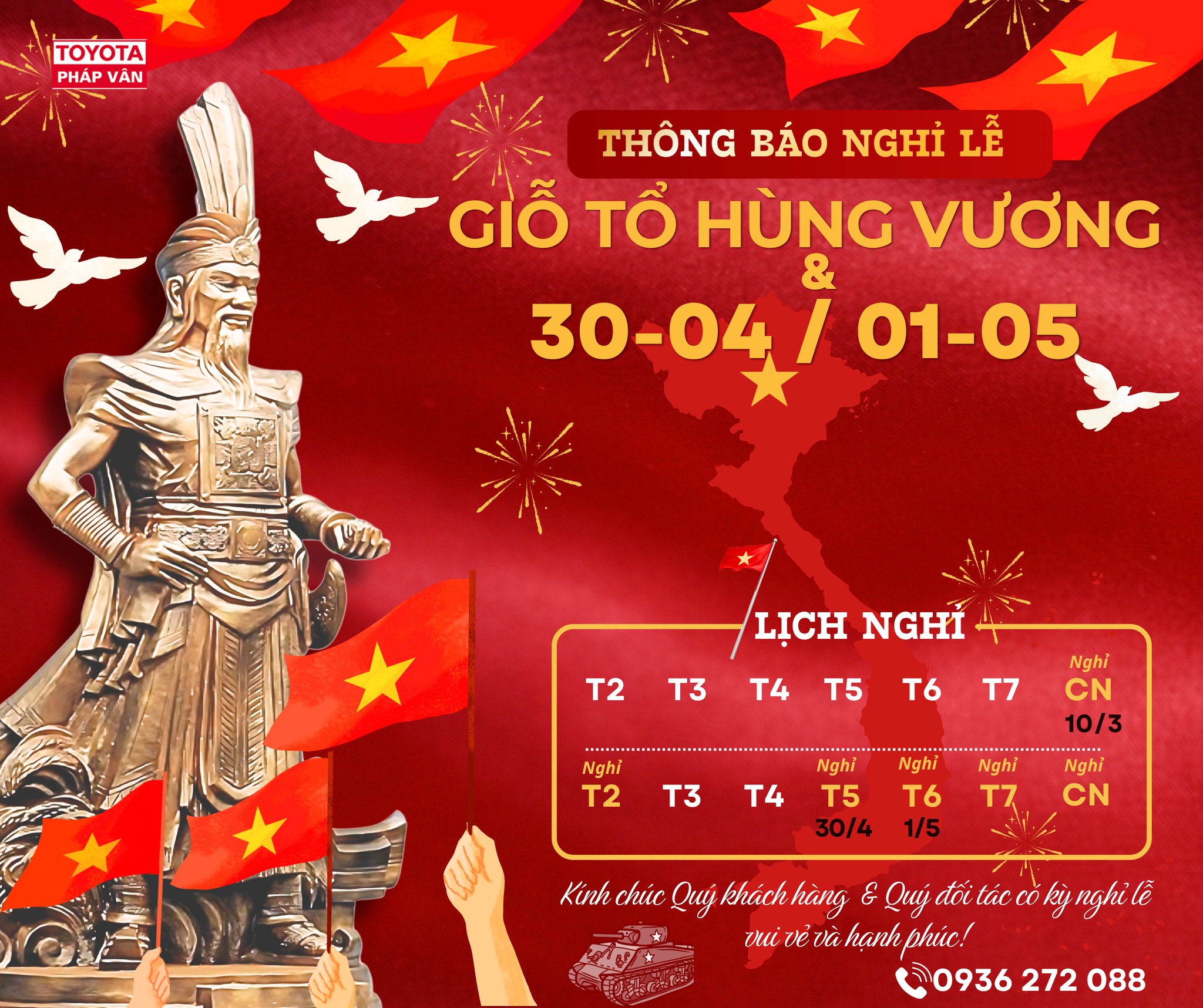TOYOTA PHÁP VÂN THÔNG BÁO LỊCH NGHỈ LỄ GIỖ TỔ HÙNG VƯƠNG VÀ GIẢI PHÓNG MIỀN NAM THỐNG NHẤT ĐẤT NƯỚC