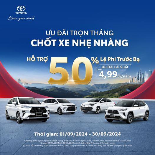 Tháng 9 này, Toyota tiếp tục mang đến cho bạn cơ hội sở hữu những mẫu xe nằm trong TOP ưa thích bao gồm Yaris Cross,Vios, Veloz Cross và Avanza premio với mức giá hấp dẫn và nhiều ưu đãi: