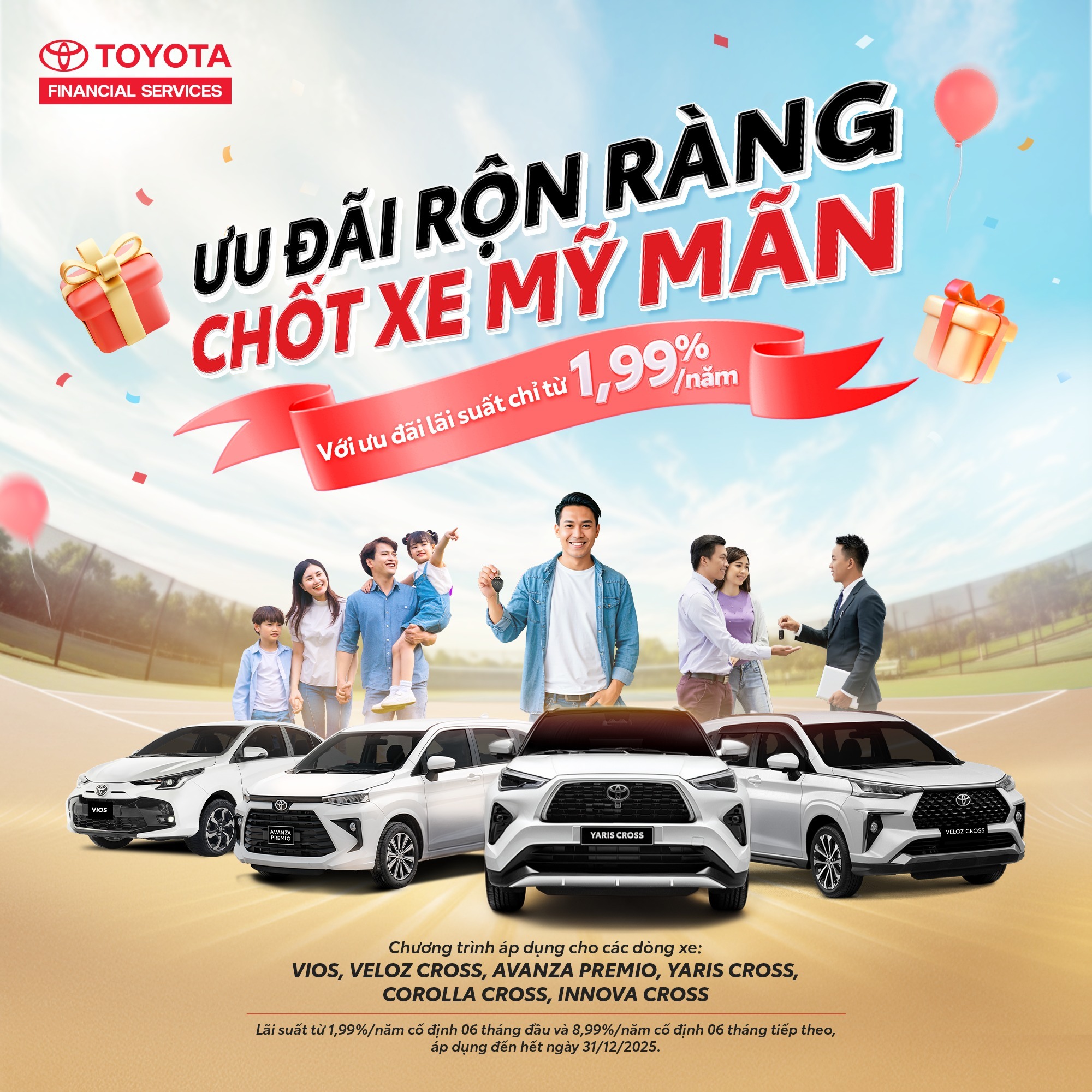 Đừng để dự định sở hữu xe chỉ dừng lại ở mong muốn. Hãy hiện thực hóa giấc mơ lăn bánh ngay trong năm nay với chương trình ưu đãi lãi suất đặc biệt từ Tài chính Toyota Việt Nam (TFSVN). Đây là giải pháp tài chính tối ưu nhất giúp bạn vừa có xe đi ngay, vừa chủ động được nguồn vốn cho các kế hoạch kinh doanh hoặc chi tiêu cuối năm.