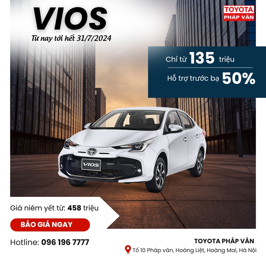 Hãy đến Toyota Pháp Vân, trả trước 135 triệu bạn có, đầu tư thêm 7 triệu/tháng, tương đương với 65k/ngày tiền lãi. Bạn sẽ được sở hữu ngay chiếc Toyota Vios Mới trong 48 giờ.